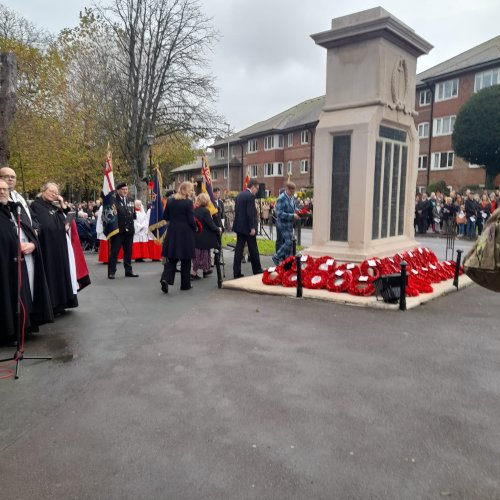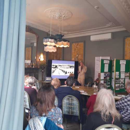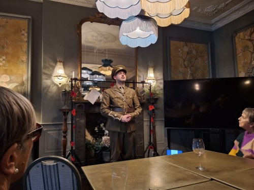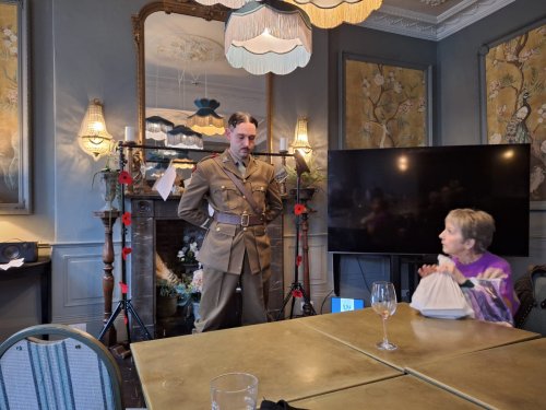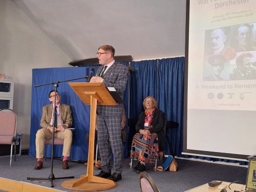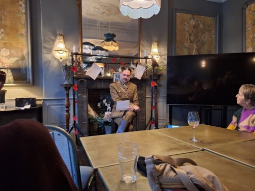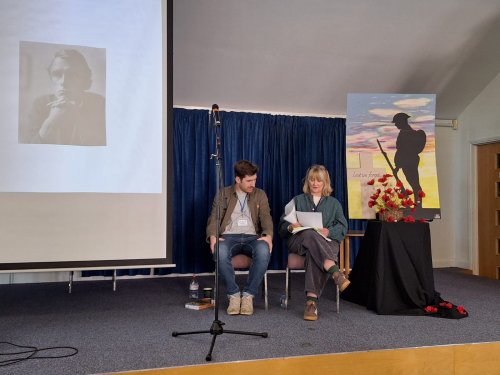 On Sunday, the conference continued at the King's Arms. The Casterbridge Room provided a good base for the day's activities, which included a very informative exhibition and talk by local historian Brian Bates on Dorchester during WW1. Wreaths were laid at the War Memorial in South Street during the Remembrance Parade and at the Prisoner of War Memorial at Fordington. A delicious group lunch was enjoyed at the King's Arms and then our talented THS Student Shaun Higgins gave an extremely moving performance of "Strange Meeting", a one-man show he wrote and performs using the words of Wilfred Owen. A powerful finish to the Dorchester War Poetry Conference.