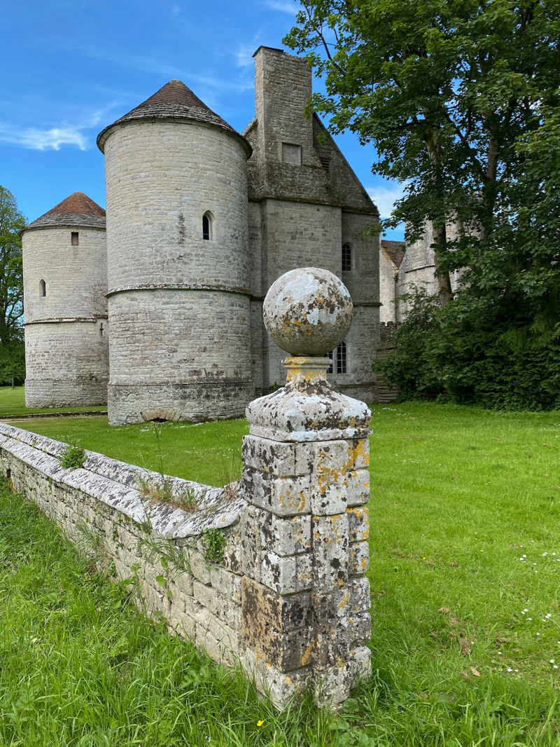 Wolfeton’s gatehouse is two storeys high with an attic and two round towers with gun-loops covering the entrance and large dovecots in the upper sections. There are also older towers on the entrance archway depicting a satyr and a woodmouse each holding staves around the door.